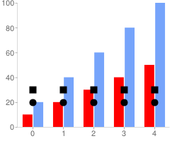 In this example, advanced syntax specifies a different data source and placement series for the markers. Circles use data from hidden series 2 and are placed on series 0; squares use data from hidden series 3 and are placed on series 1. |